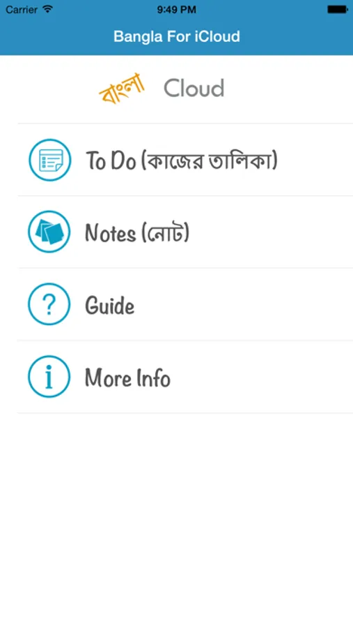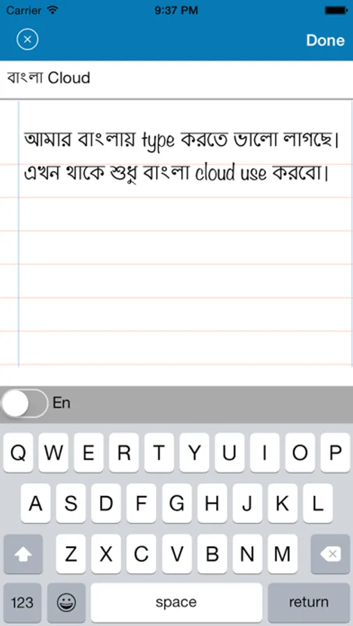 Bangla Cloud : ToDo List and Note Editor first time Bengali App integrated with your iCloud Account. Access TodoList & Note from your any device. You create your ToDo Task , write note easily with Phonetic Keyboard. It uses Avro Phonetic keyboard layout. This app has most effective user friendly phonetic keyboard.