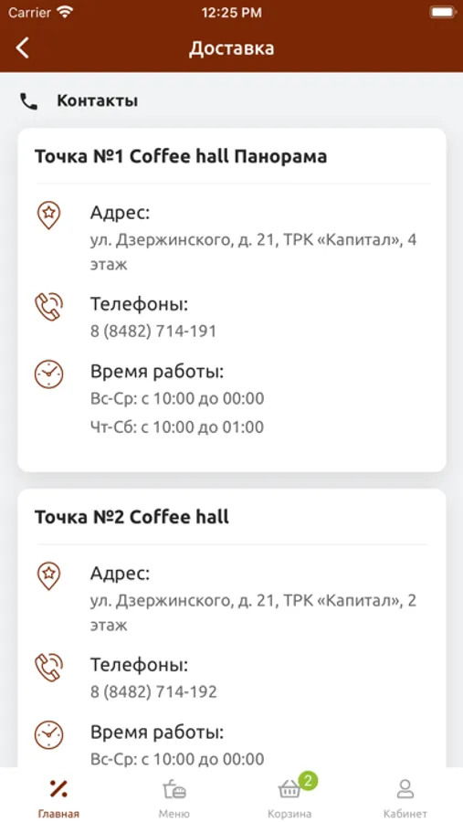 Наши кофейни – это локации, объединяющие людей с кардинально разными вкусами. Поэтому в Coffee Hall найдут чем перекусить и отчаянные кофеманы, и поклонники популярного фастфуда, и ценители правильных стейков. Все заведения бренда готовы к приему гостей ежедневно. Часы работы службы доставки вс. – чт. 10:00 – 23:00; пт.– сб.10:00 – 00:30.