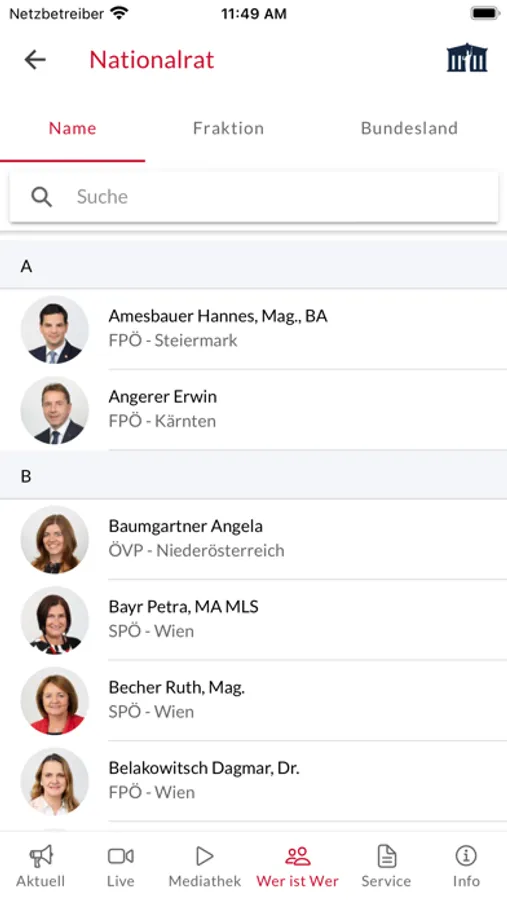 Im Bereich „Wer ist wer“ finden Sie Fotos und kurze Biografien aller MandatarInnen in Nationalrat und Bundesrat sowie der Mitglieder der Bundesregierung mit Kontaktdaten. Neben der „Transparenzliste“, Liste gemäß § 9 Bezügebegrenzungs-BVG, sind die aktuelle Mandatsverteilung und der Sitzplan im Nationalrat und im Bundesrat abrufbar.