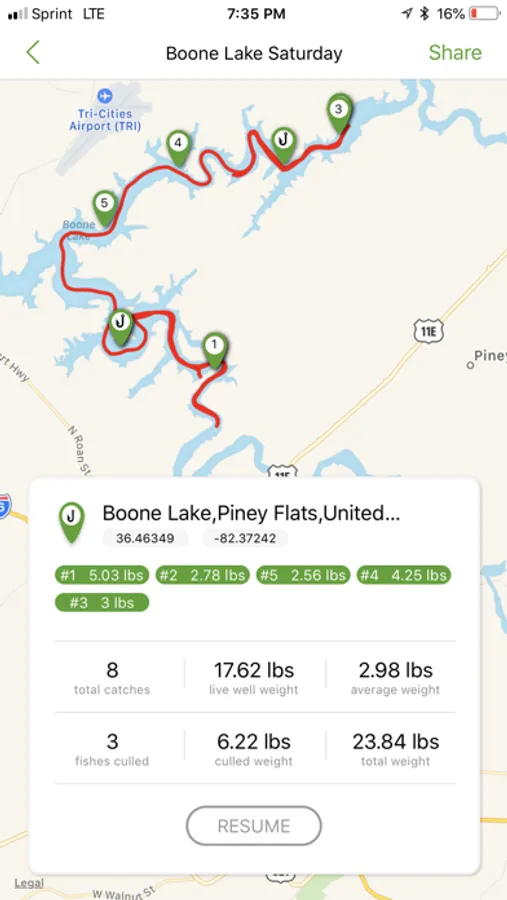 Follow other users and see information on # of followers, # following, # of Catches and key statistics on personal best, average weight, and total weight. View and Edit your Profile name and Profile image. View pin drops of all of your catches on a map, see your last three tournaments or view detailed analytics with time series charts of catches and histogram results by Species, Bait/Lure, & Fishing Technique.