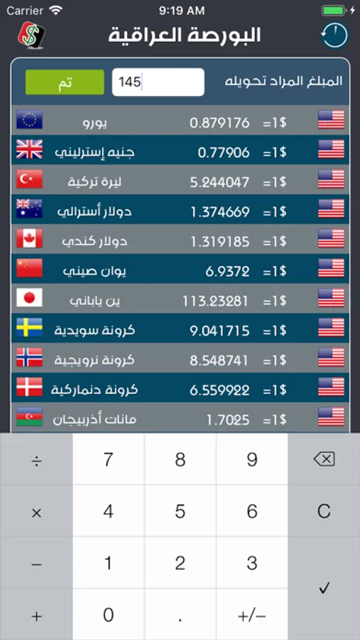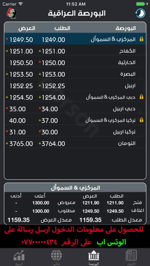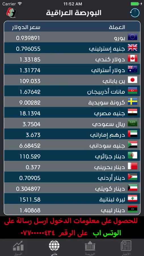 نرخەکان دیاری کراوە ڕاستەوخۆ لە بازاڕ و شوێنی گۆڕینی نرخی دراوەکان پێویست بەوە ناکات بڕۆیت و پرسیار لە نرخی دۆلار بکەیت چونکە نرخەکان لەناو مۆبایلەکەت بەردەست دەبێت لە ماوەی دوو خوولەکدا ناوەندی نرخی دۆلار لە باکوور و باشووری بەغدا نرخەکانی بۆڕسەکانی عێڕاق وەک بۆرسەکانی کیفاح حارثیە بەسڕە هەولێر سلێمانی دهۆک ههتد ..
