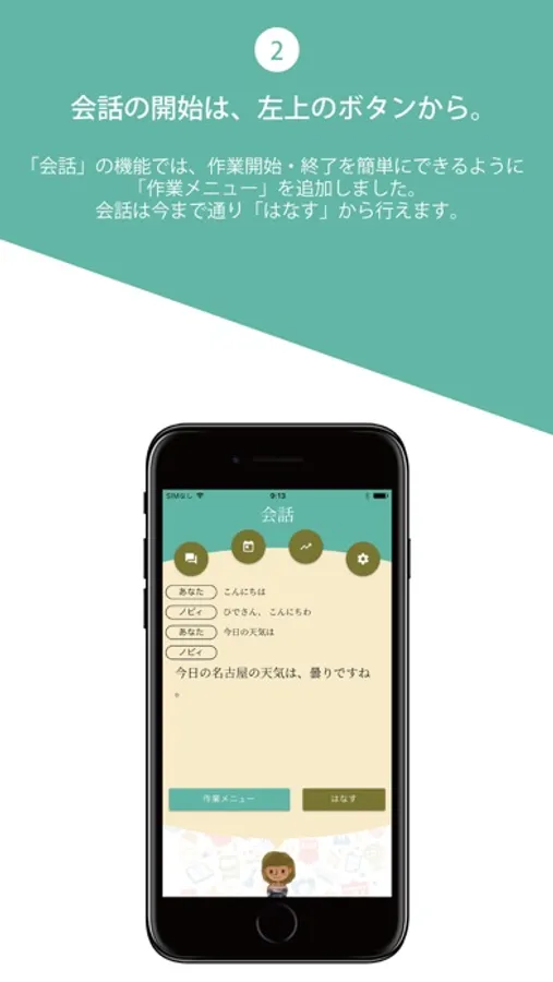 作業開始・終了を簡単にできるように「作業メニュー」を追加しました。会話は今まで通り「はなす」から行えます。