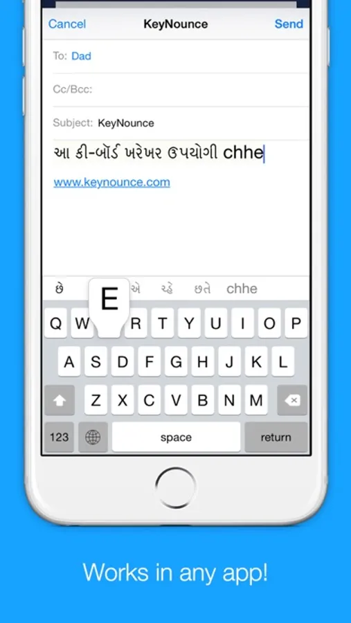 KeyNounce works in any app! Once you enable the keyboard you’ll be able to easily compose texts, emails, tweets, facebook posts, and search the web in Gujarati.