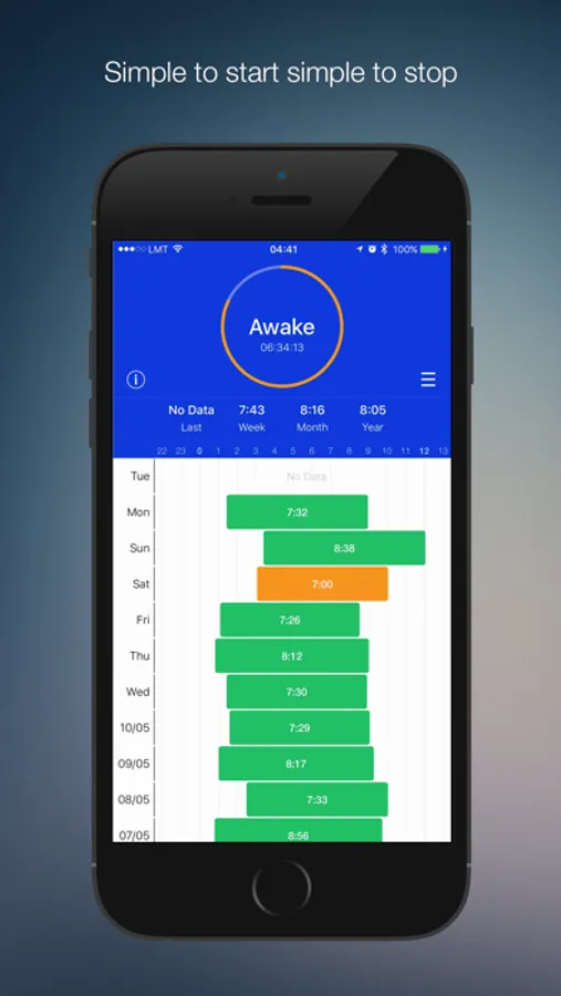 This app will allow you to track how much time you spend in bed, provide an overview of your "go to bed" times and time when you awake. Tap Sleep before going to bed - tap Awake when you woke up and this is it.