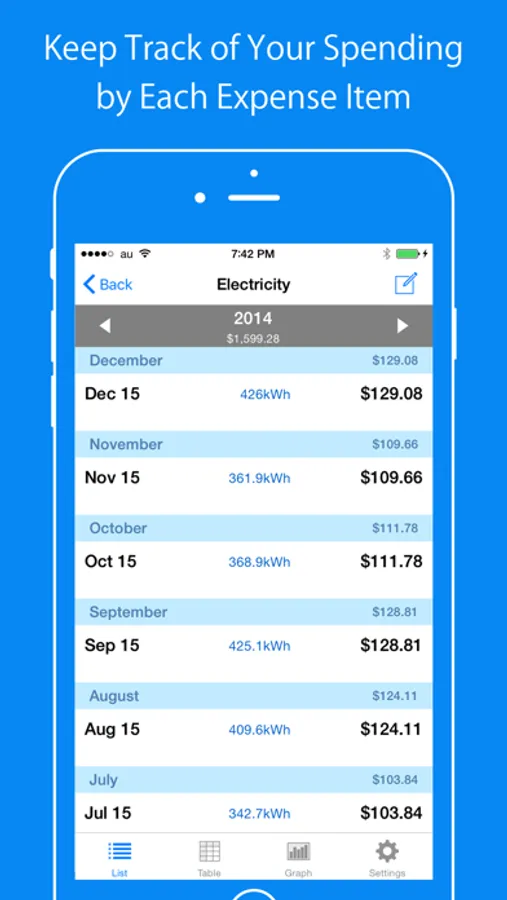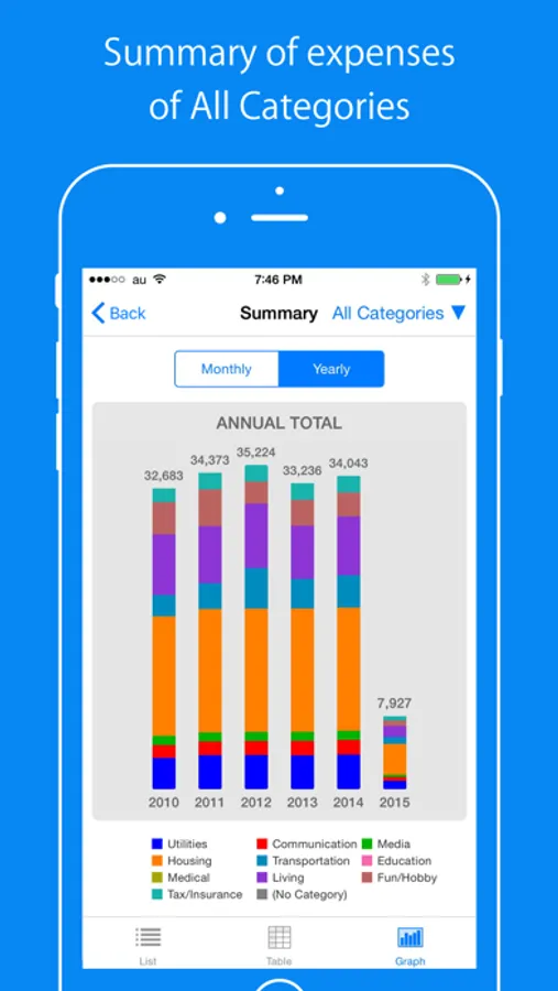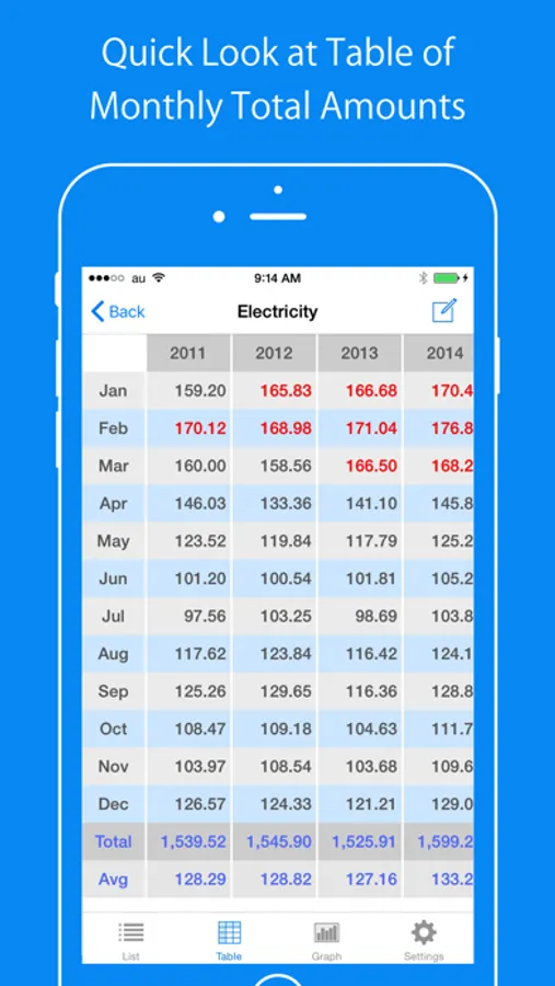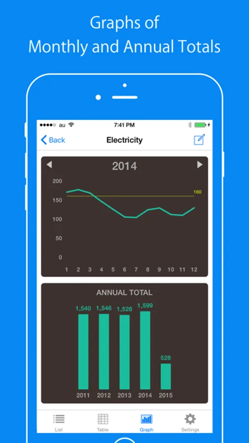 • Graph tab: monthly totals in line graph, yearly totals in bar graph