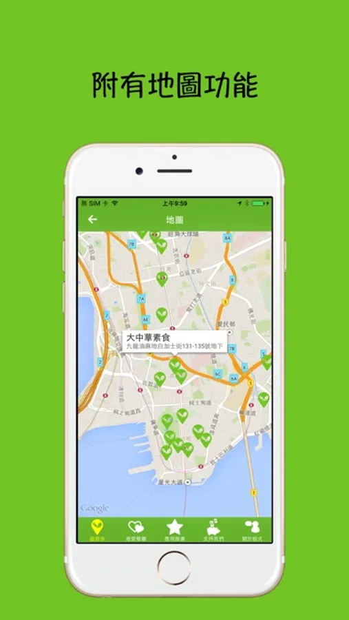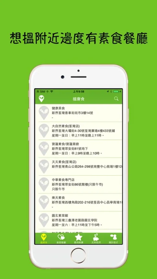 可輸入地區或地址,找尋在您附近的素食餐廳。搜尋結果會列出餐廳的詳細資料,方便你查詢;亦附有地圖功能,即使您唔知間餐廳在那裡都可以照地圖指示搵到間餐廳!