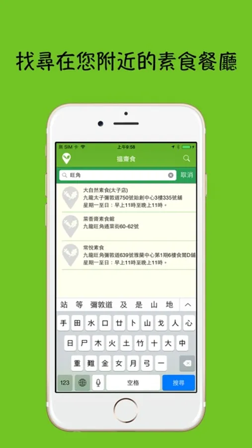 You can easily search and find the Vegetarian restaurant through this App. We list out the details of Vegetarian restaurants in Hong Kong. Also we provide the map function for you so you can easily follow the map indication to find the restaurant.