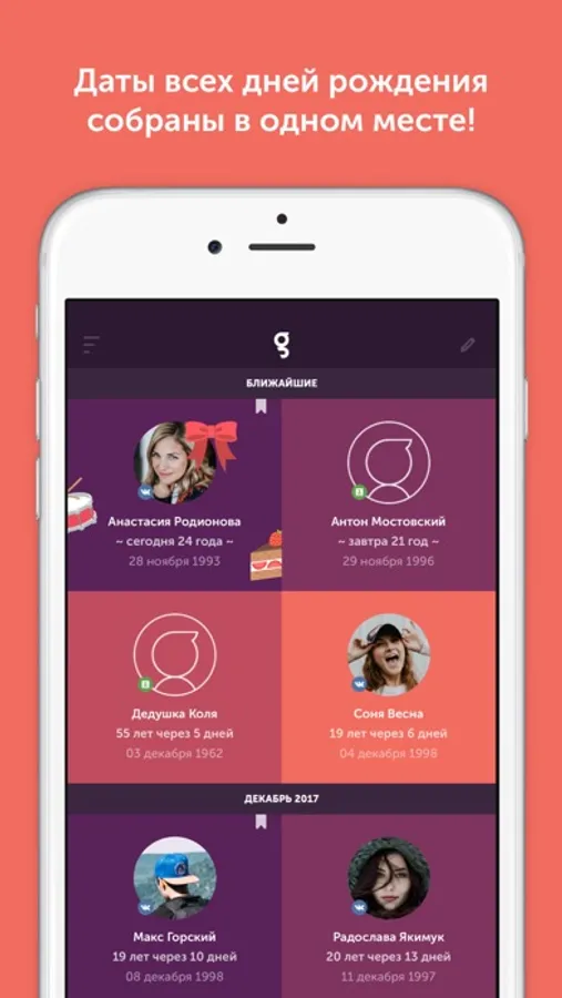 Удобный интерфейс и система уведомлений, благодаря которым ты всегда будешь готов поздравить своих друзей и близких! Так же доступна синхронизация с Адресной книгой и ВКонтакте!
