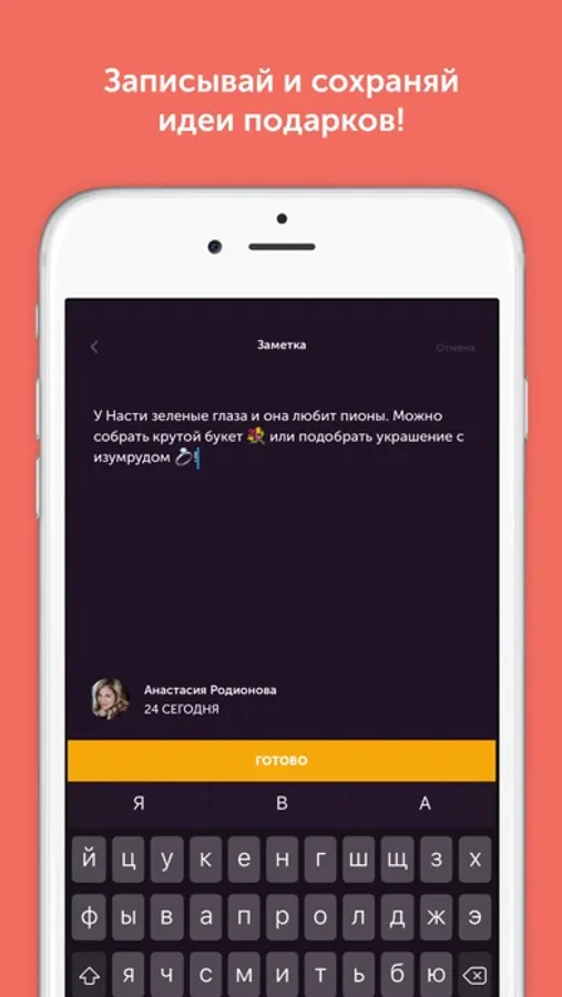 Есть идея подарка для близкого человека, сейчас ноябрь, а тот самый день в марте следующего года? Все просто! Для этого есть GiveGift. Записываешь идею и возвращаешься к ней в нужный момент.