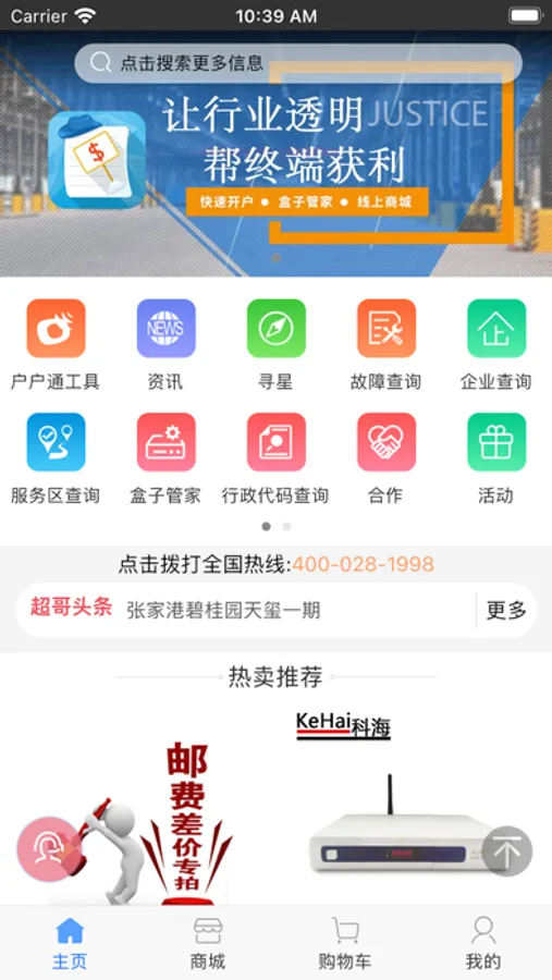 户户通版功能介绍:免费帮用户推广产品、一键开户、一键移机,换机换卡操作、行政区域查询,寻星针,更有资讯曝光行业内幕。