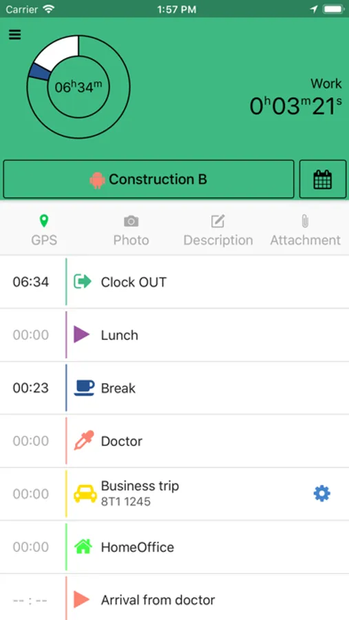 Users can attach a photo, comment, or the current GPS position to attendance events. When recording businesstrip, GPS position can be tracked and sent continuously.