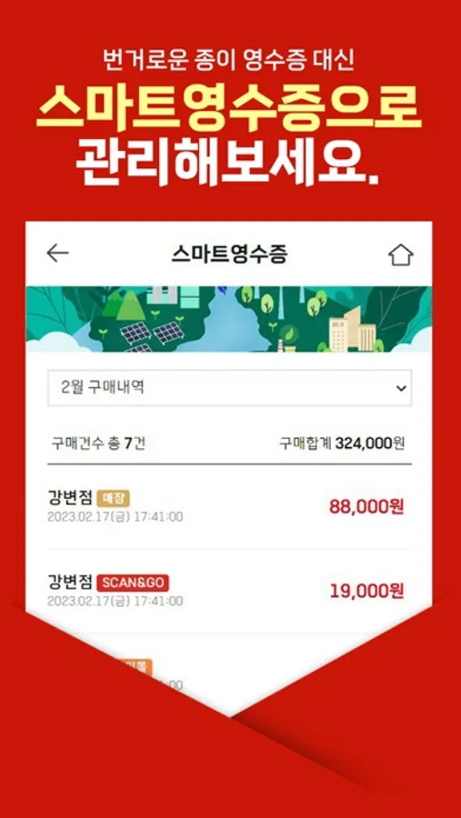오프라인 매장/ 온라인몰 구매 내역을 모두 번거로운 종이 영수증 대신 [스마트영수증]으로 편리하게 관리할 수 있어요.