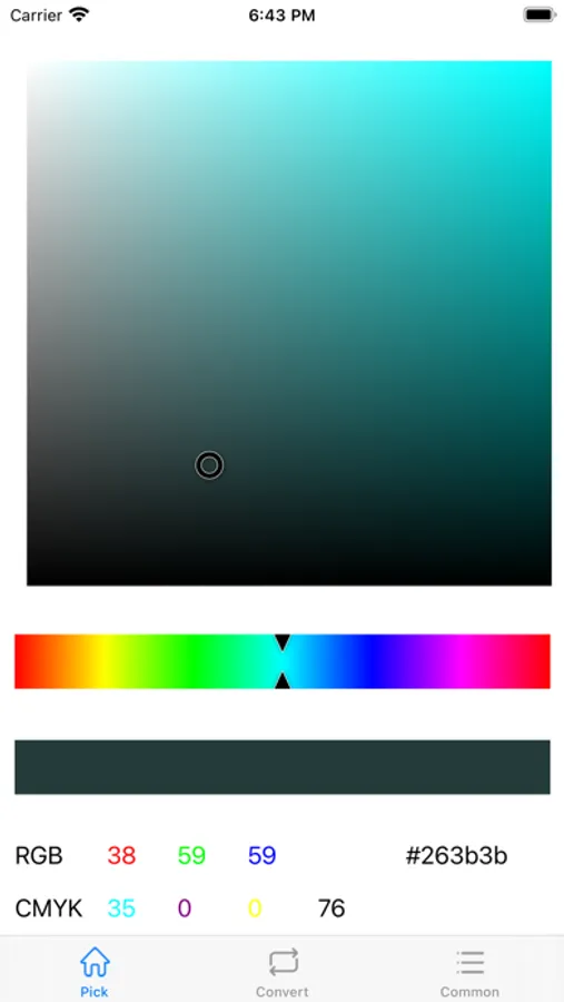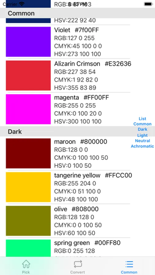 This application is a color tool application. Its main functions include color extraction, which fully implements the color picker function on the PS. The user can extract the desired color, supports RGB, hexadecimal values, and CMYK, and colors between the three Conversion function, and a list of commonly used colors classified.