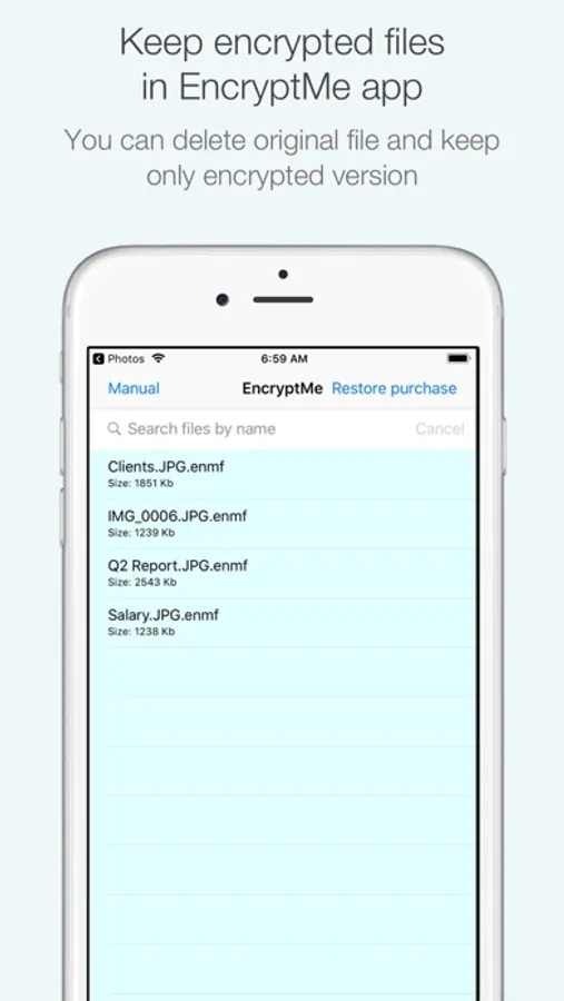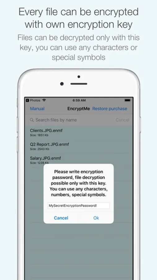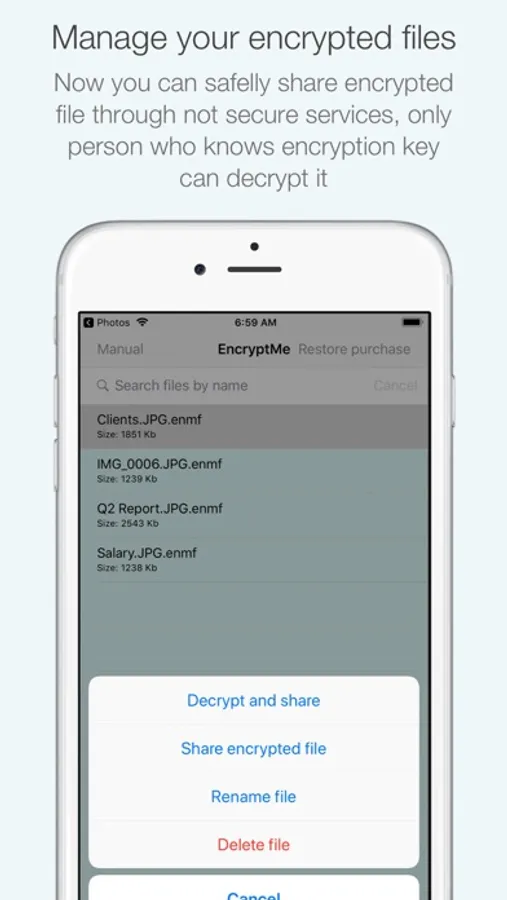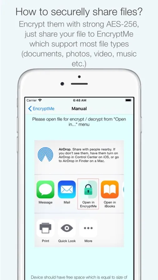 EncryptMe is easy to use encryption app that can encrypt most file types (documents, video, audio, archives and other) with strong AES-256. You can securely keep save or send your data to any recipient with standard services (email, file cloud sharing and other).