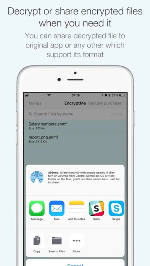 **EncryptMe support most of apps what support open files in external application and have "Open in application..." menu, apps like Apple iWorks, Google Docs, Dropbox, Google Drive, Apple Mail, Gmail, Outlook, Scanner Pro, iMovie, Photoshop Express, Google Photos, Aviary and many others.**