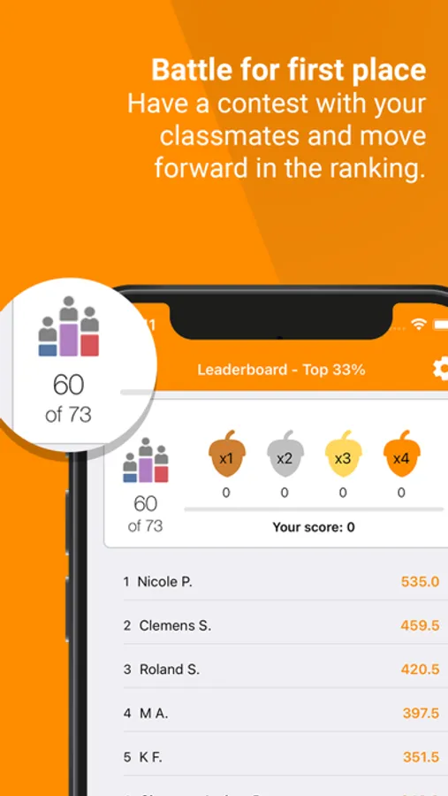 In the ranking list you see yourself and the TOP 33% of your classmates. If you are not assigned to a teacher, you will be compared to all other students who also practice independently of a teacher. Are you one of the best?