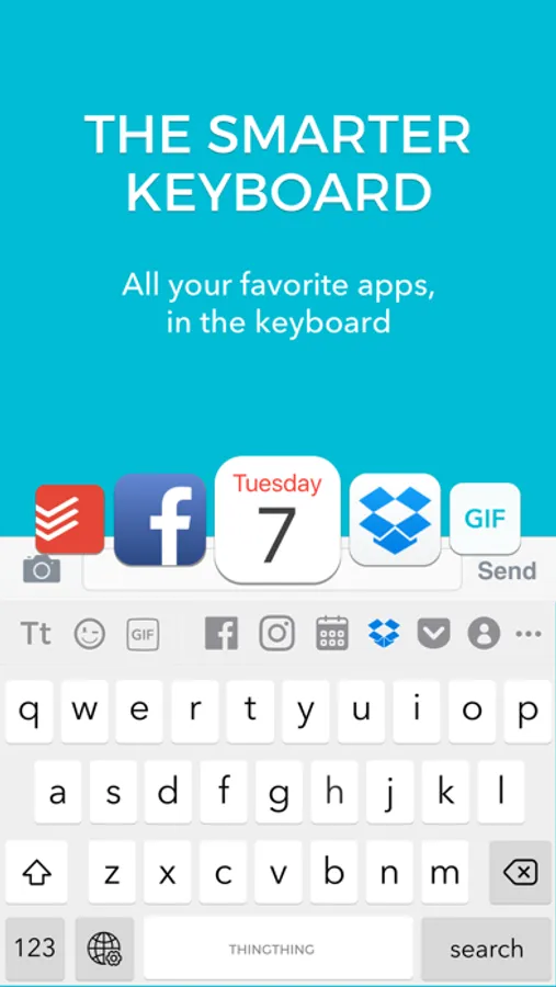 With Thingthing keyboard you can connect your Calendar, Dropbox, Box, Google Drive, Todoist, Facebook, Instagram, Pocket, Photos, GIFs, Location, Contacts, and more, all within the keyboard, and everything you type remains private.