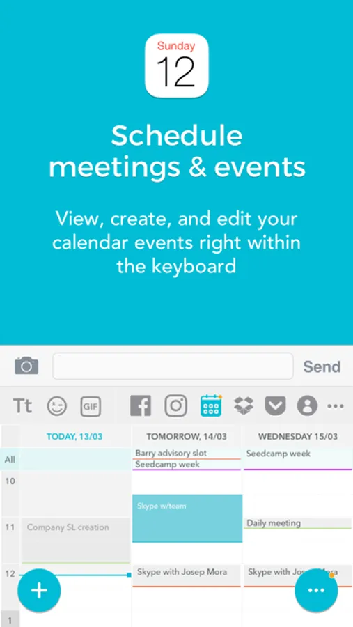 Access your calendar to conveniently select and share your available slots. Schedule the perfect time to meet 1-to-1 or as a group, without switching apps. Plan your schedule in ANY messaging app through the keyboard.