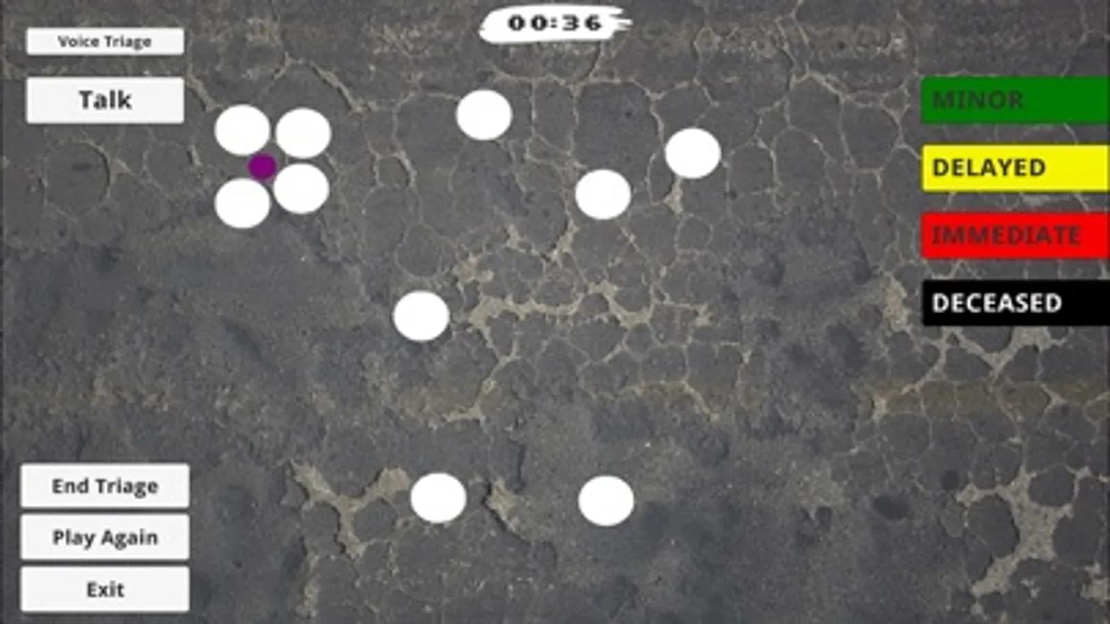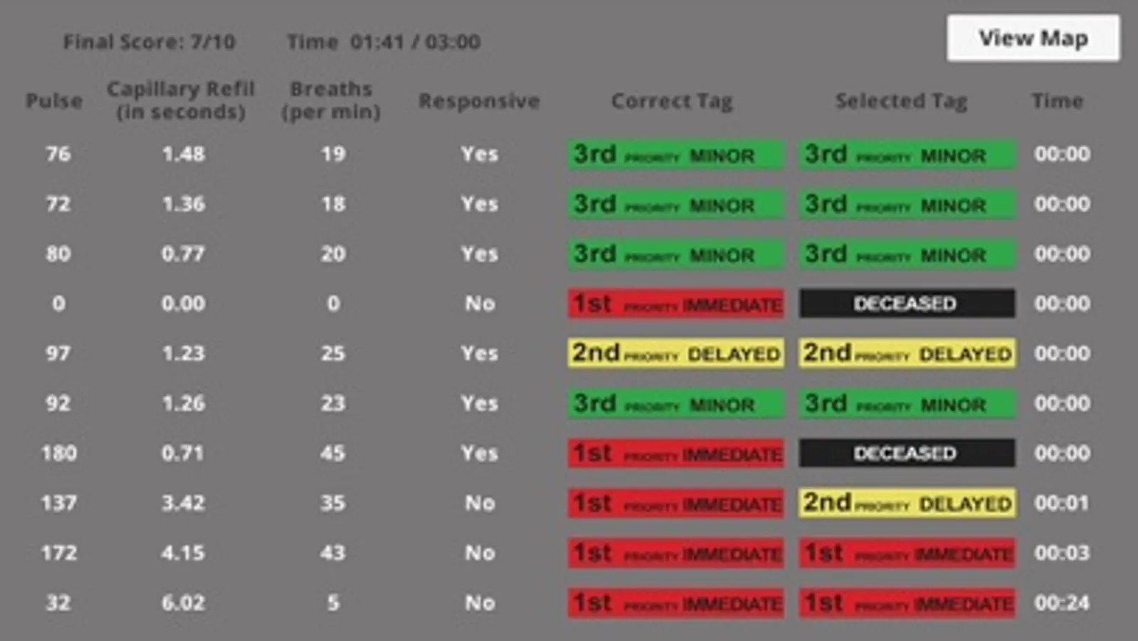 Practice the basics of START triage by interactively evaluating disaster victims’ condition and tagging them with the correct classification. Determine the unique victims’ Respiration, Perfusion and Mental Status (RPM) before tagging and moving on to the next victim.