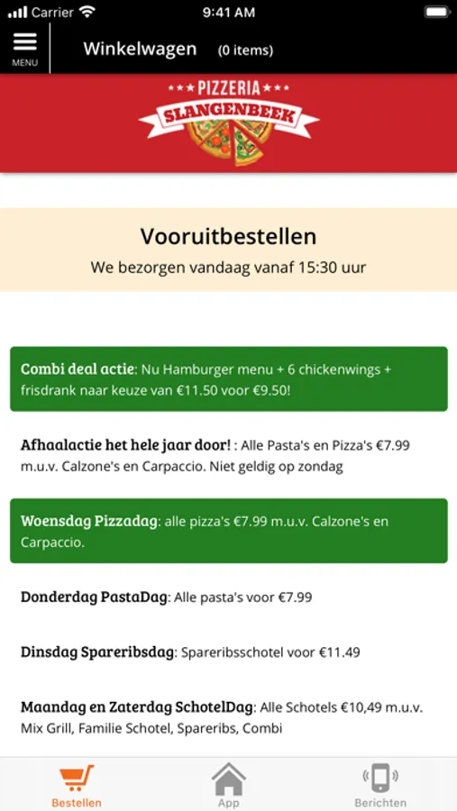 Download onze app en blijf op de hoogte van het laatste nieuws en de nieuwste acties, aanbiedingen en kortingen. Via onze app kunt u onze menukaart bekijken en direct vanaf uw telefoon uw bestelling plaatsen. U kunt via de app ook met iDEAL betalen!