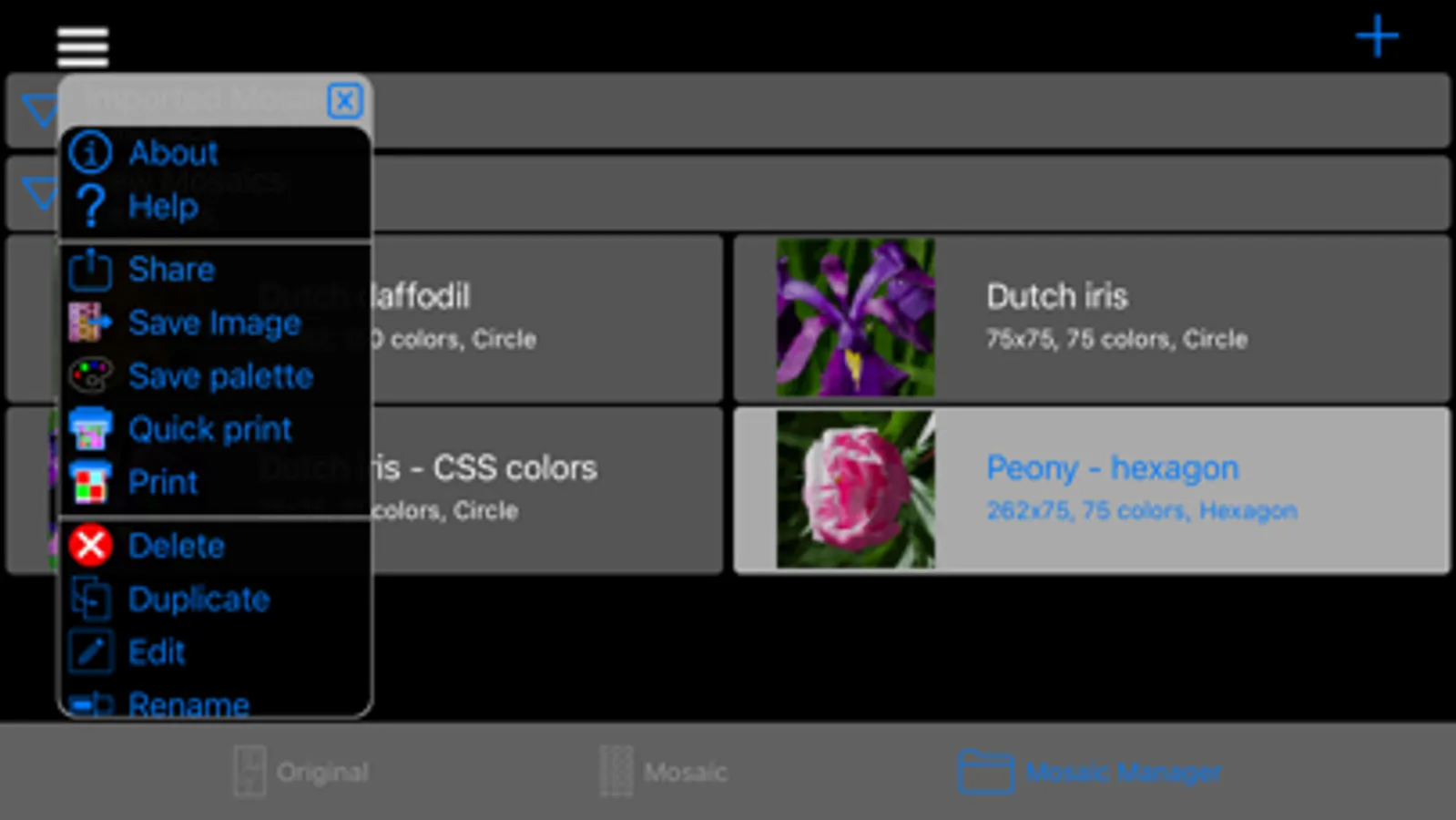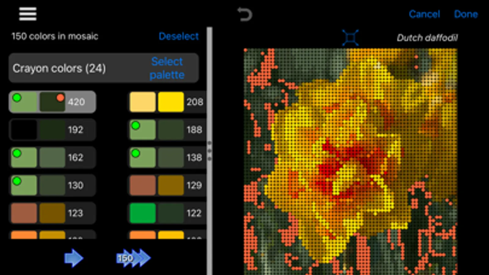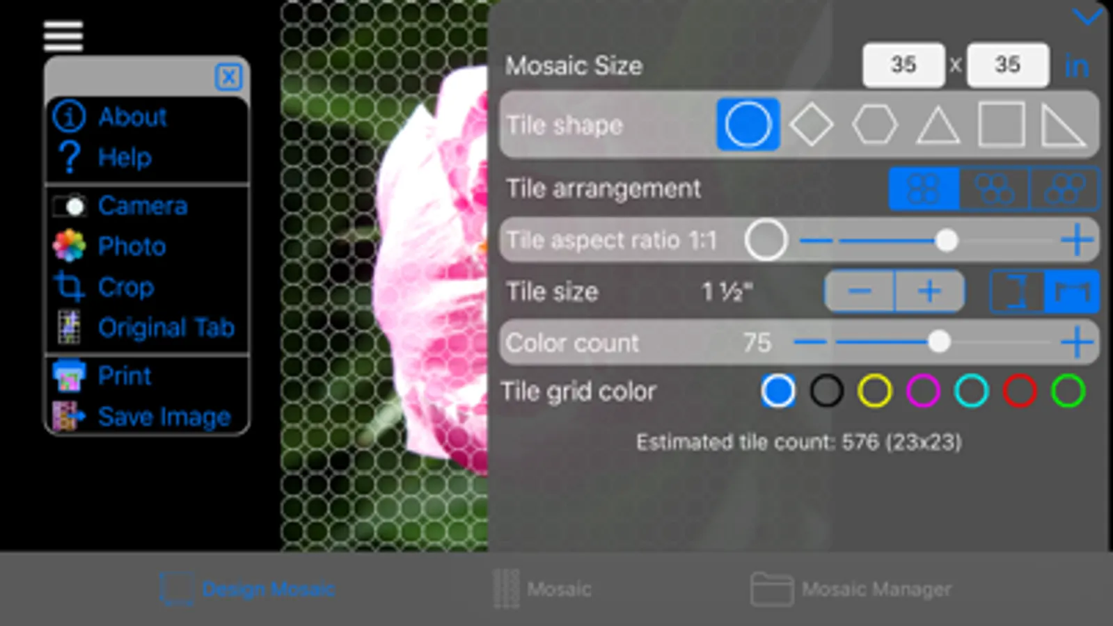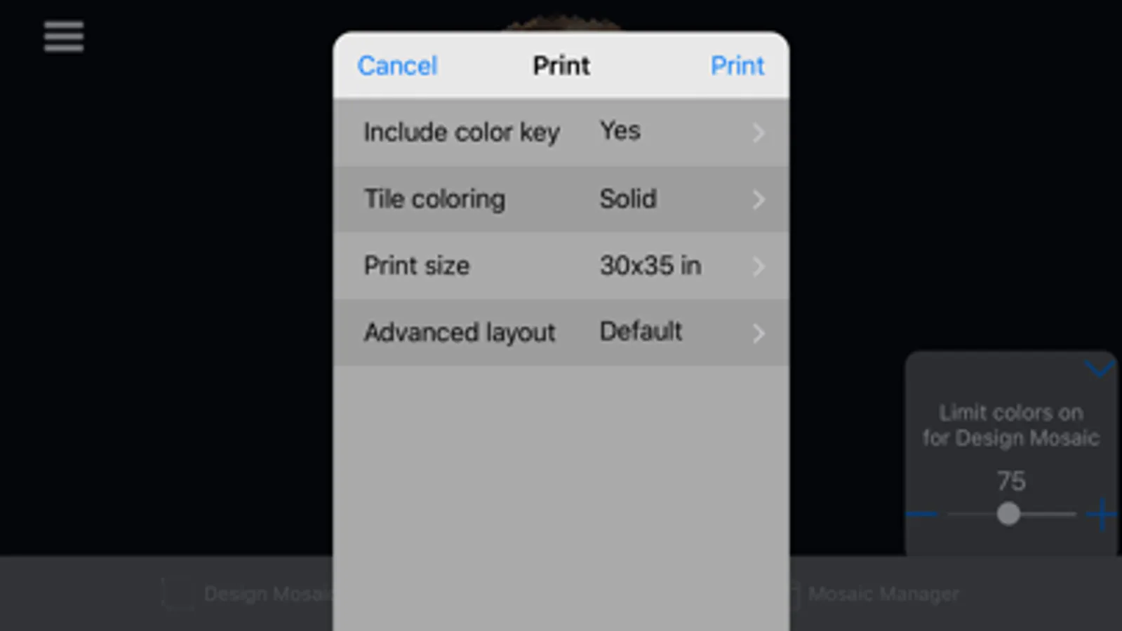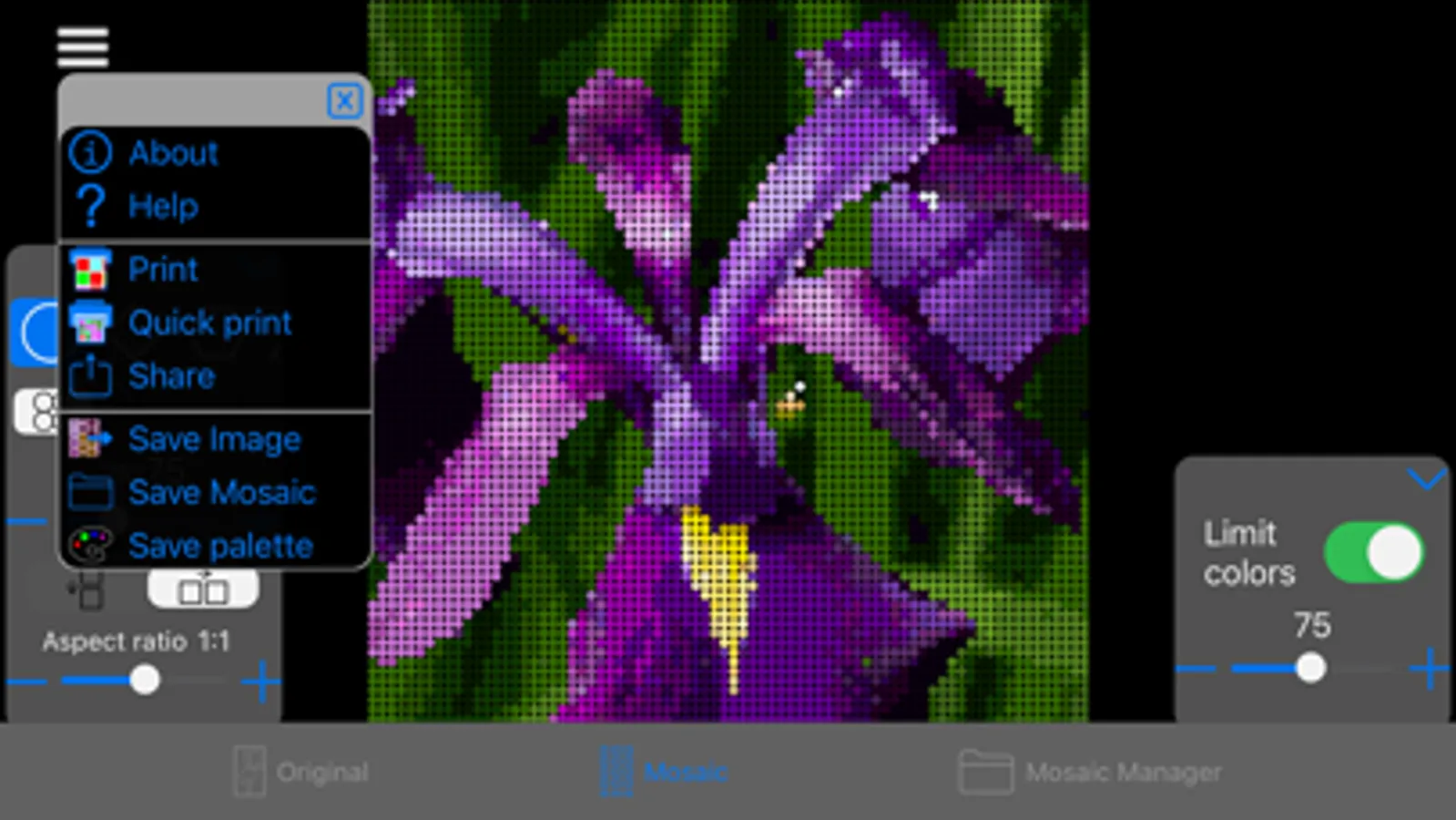 Too many colors in the mosaic for your purposes? Just tap the “Limit” button and then adjust the slider to choose the number of colors that does suit your purposes. Or, use the Mosaic editor to choose exactly the colors you want – including using a palette to assign colors to the Mosaic.
