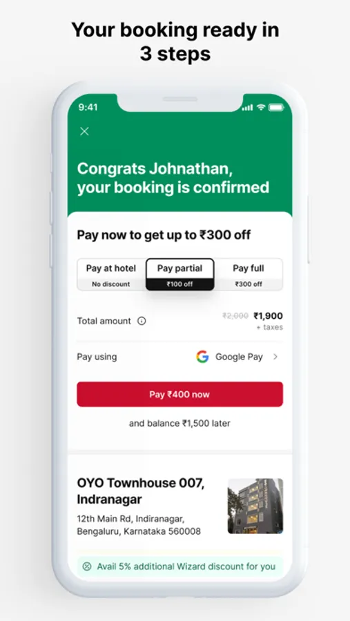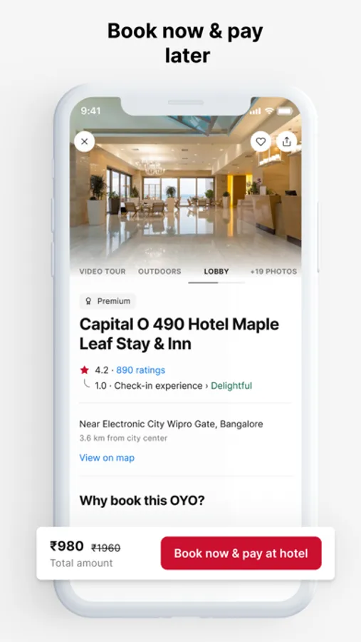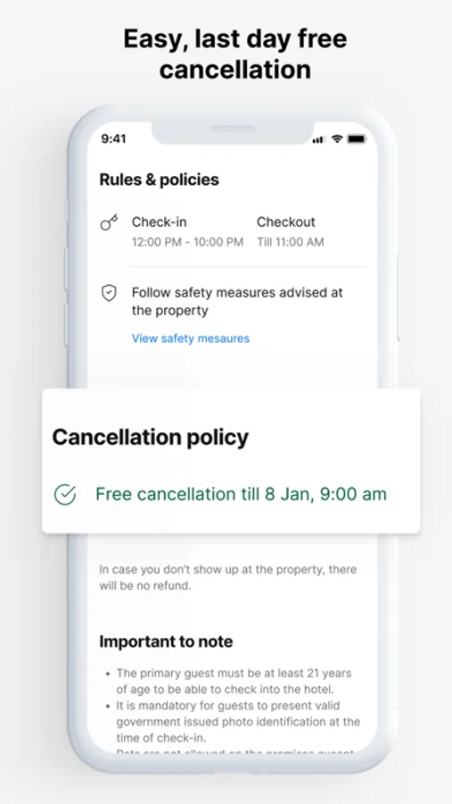 OYO is a smart app that allows you to make the booking from anywhere through debit/credit cards, net banking, UPI-BHIM, Google Pay, PhonePe, PayTm, PayZapp, WhatsApp, MobiKwik, Ola Money and Freecharge. You can also skip the hassle and pay directly at the hotel upon check-in. Easy cancellations make for hassle-free & convenient bookings and quick refunds help you make fast decisions without any worry.