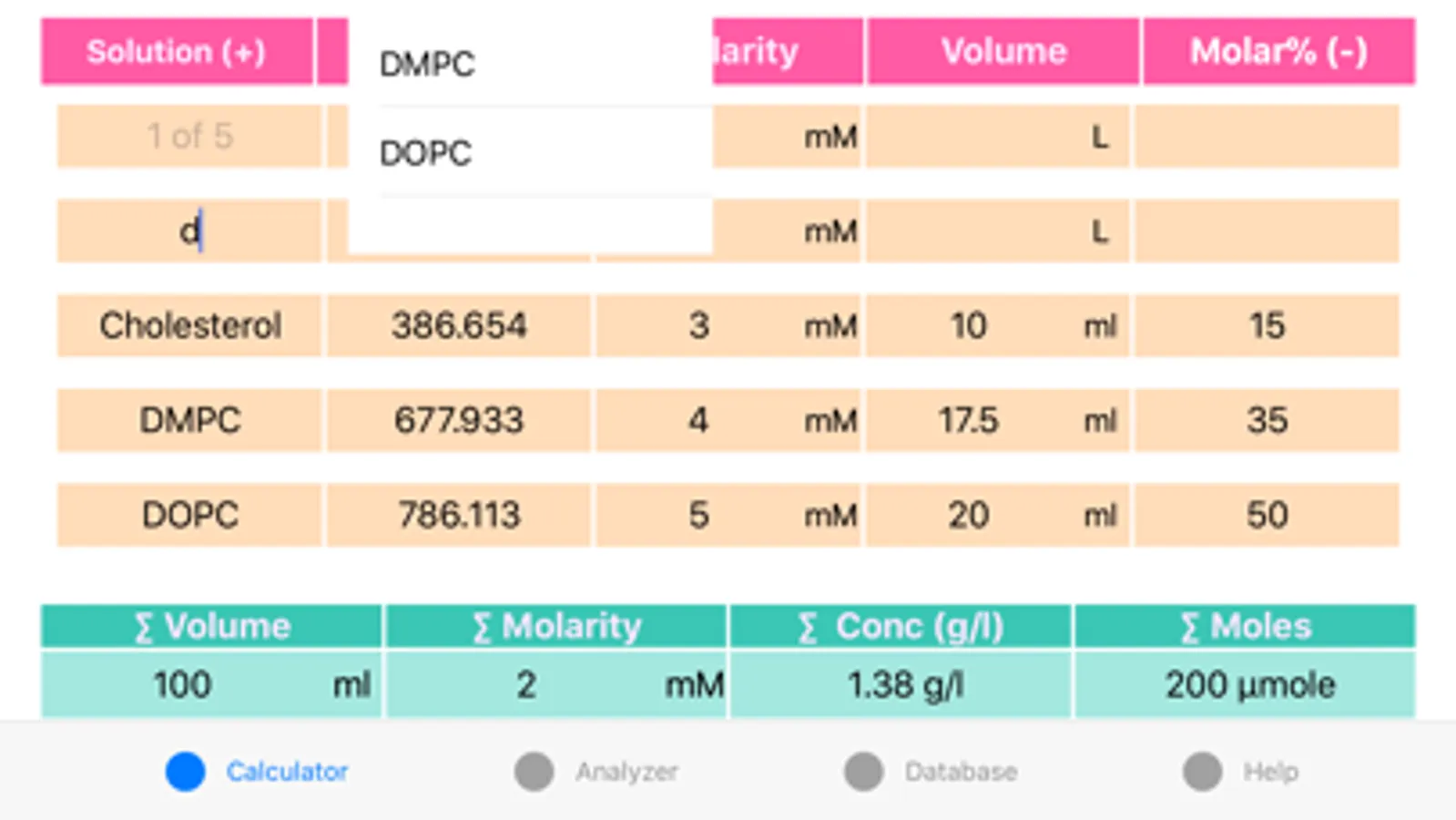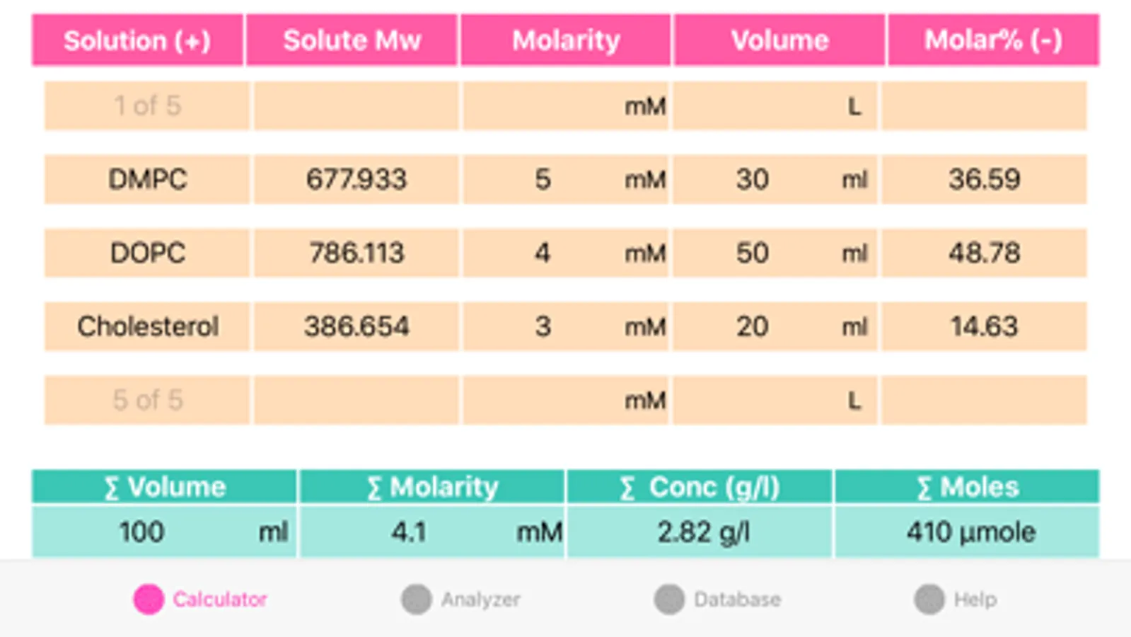 Liposome Calculator helps in preparation of liposome solutions. Components concentrations (molarity and mg/ml) and moles, and volumes of stock solutions are calculated based upon data provided, such as: initial concentrations of the stock solutions, and required molar ratios.