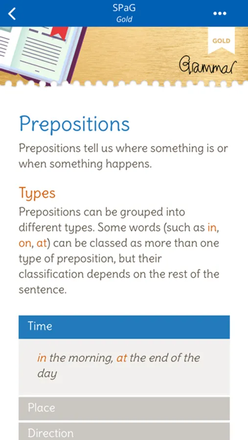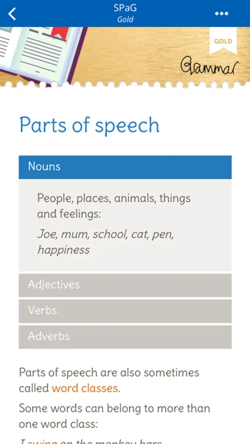 SPaG Gold covers grammar, sentences, prefixes and suffixes, spelling and punctuation with lessons and quizzes for each topic, as well as over 250 audio spelling questions and over 40 activities.
