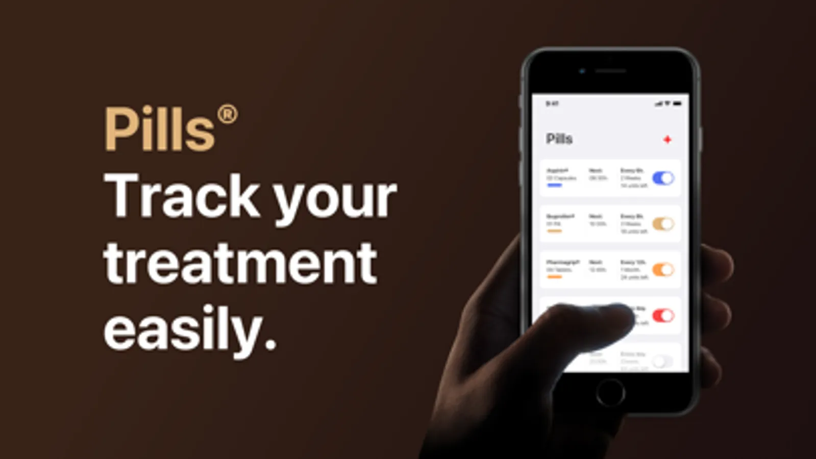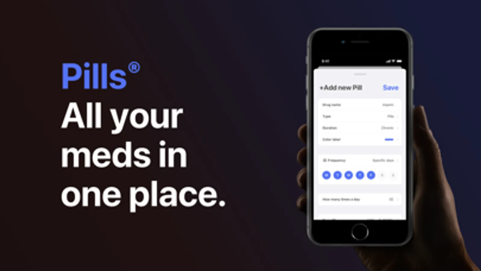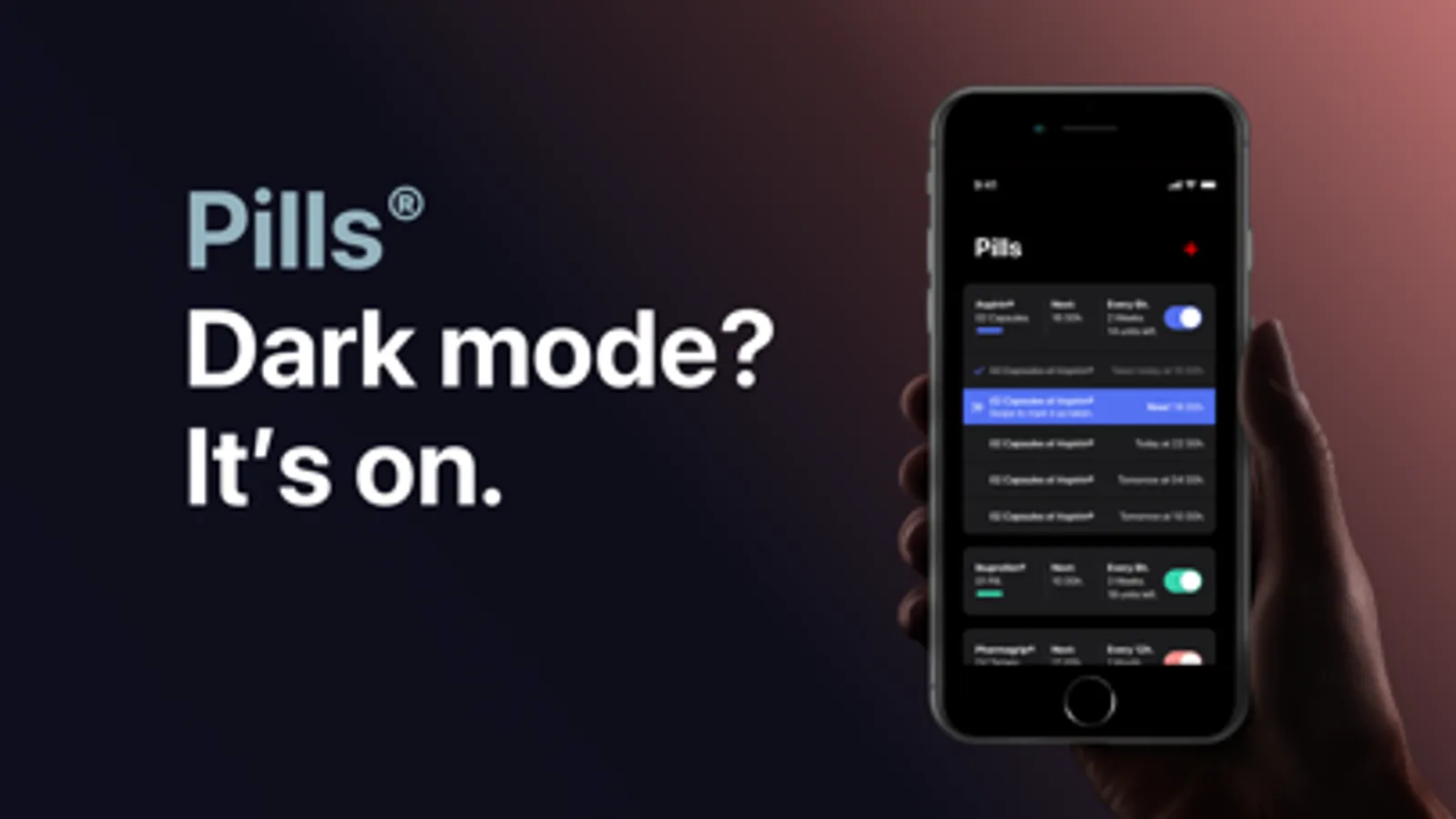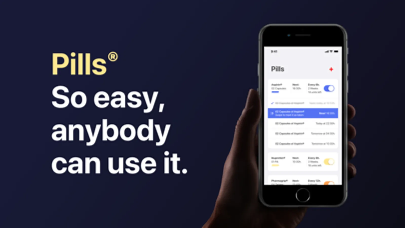 Pills provides you with a very simple and intuitive platform to remind you to take your medicine. It also tracks how many doses you have left and shows a refill alert when you're running low. You can also customize your pills and take advantage of the new iOS 13 functionalities like critical notifications and dark mode. So lay back and focus on the things that really matter. We'll take care of the rest.