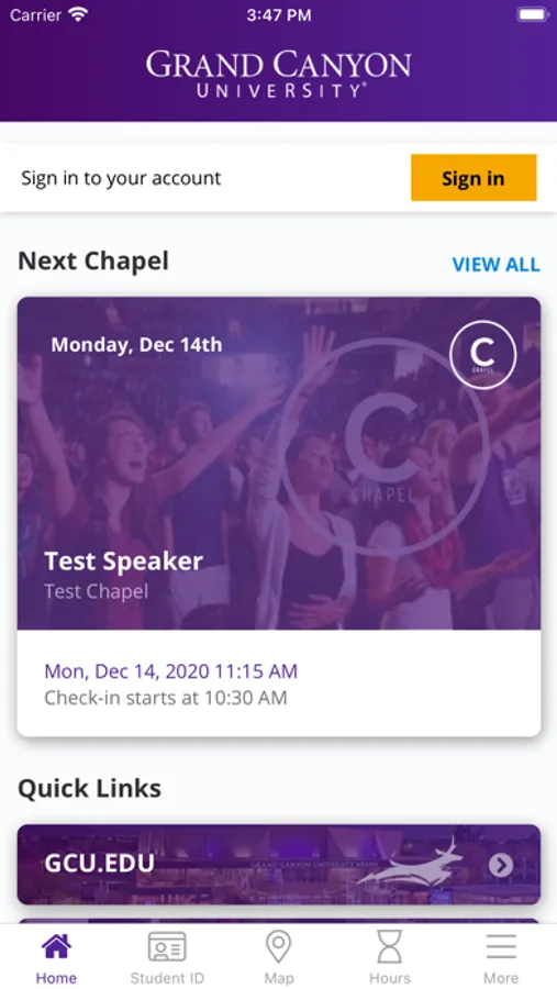 Welcome to the Grand Canyon University mobile student application. This application will help registered students throughout the day, as well as provide basic information for those who aren’t students.