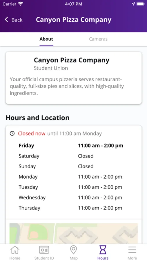 -Dining venues offer hours, descriptions, and food line cameras.