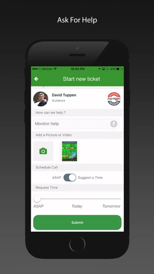 AgriSync enables farmers and advisors to connect and resolve support issues on the farm. Farmers can connect with multiple advisors from different companies to submit and receive support in real-time via video. Advisors can manage multiple famer service tickets through a dashboard and remote video that allows them to see what the farmer sees in real-time. A Web-based customer service dashboard allows the advisor's organization to see open cases, resolution status and farmer feedback in real-time. By downloading AgriSync you agree to our privacy policy and terms of use.