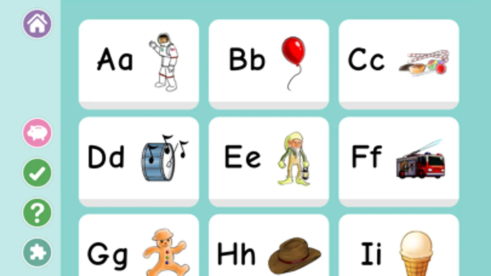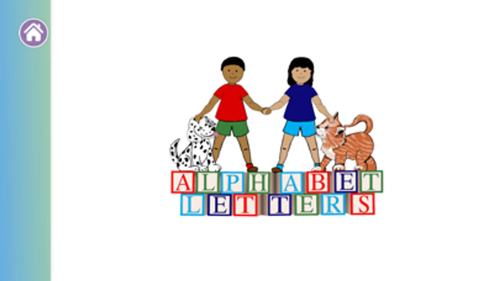 (1) Alphabet Letters, introduces the 26 basic letter/sound combinations of the English alphabet, with three picture/audio/text examples demonstrating each letter. Optional quizzes encourage children to select the correct letter/sound to earn puzzle pieces, create a classic picture, and hear a traditional rhyme illustrating the target letter/sound.