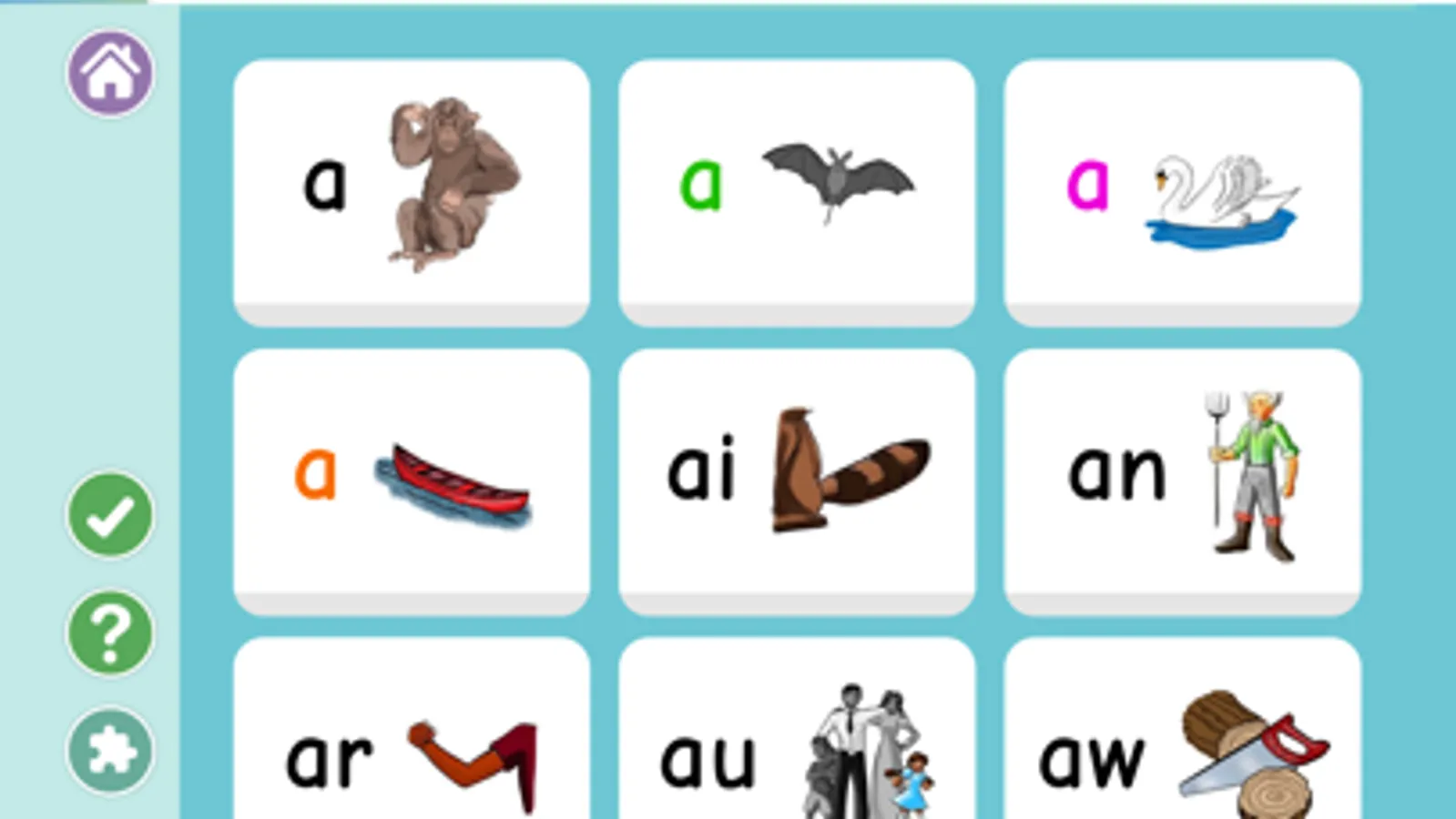 (2) The Phonics option builds on Alphabet Letters by demonstrating 92 of the most common American-English letter/sound combinations, each with three sample words and focused quizzes. Any child who earns the 12 pieces to create one of the 92 target puzzles will have mastered that target letter-sound combination. Learning phonics allows children to decode and learn to read most words, but Brainy Phonics also guides them to immediately recognize sets of quite common short words without using phonics, selected verbs (can, run, play, etc.), pronouns (he, she, you, it, etc.), prepositions (in, to, of, with, etc.), adverbs (up, down, well, etc.), adjectives (good, pretty, blue, etc.), conjunctions (or, and, but, etc.), and other words.