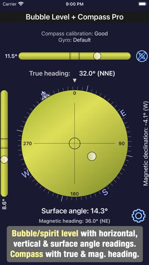 A bubble/spirit level tool, with both a bull's eye level and horizontal/vertical levels, as well as a compass (showing both true/geographic and magnetic north), and support for the Apple Watch. Watch support allows you for example to set your iPhone on the top of a tripod, and work on leveling its legs by looking at your watch - without having to go through the stand-up-to-look-level/crouch-to-adjust-leg routine.