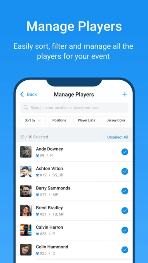 - Filter players by position, evaluation skills, jersey colours and player lists