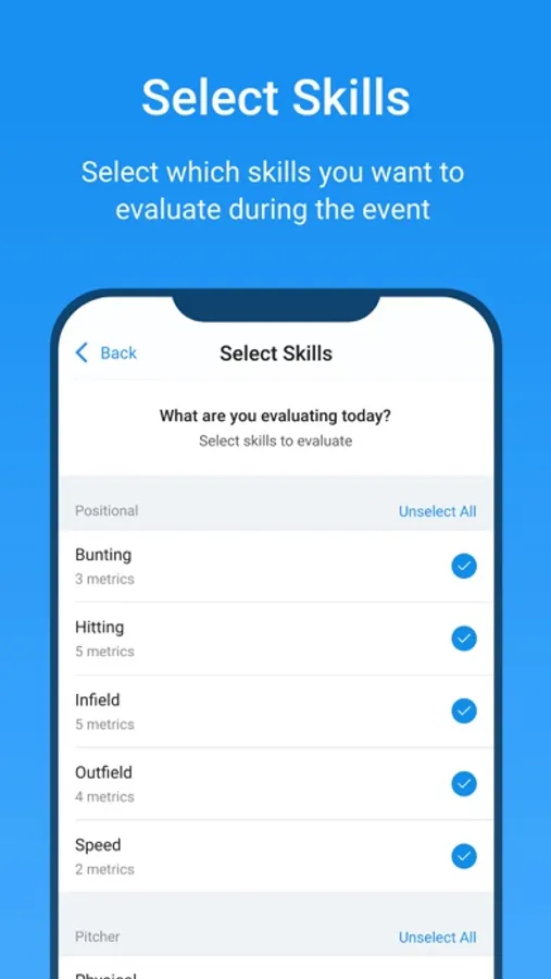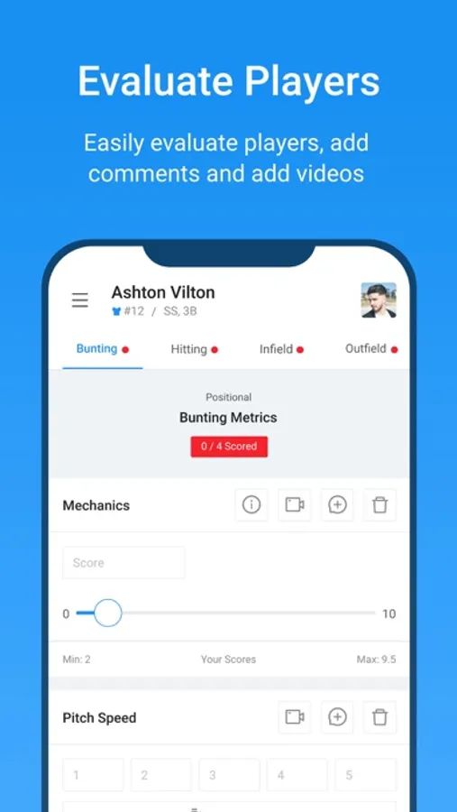 After setting up the evaluation event through the SkillShark web application all evaluators and coaches can download the mobile app to start capturing player data. There they can add comments, take videos and capture measurable data. Scoring options include: