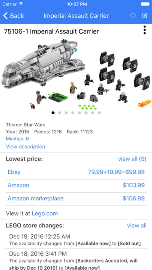 BestBrickPrice app supports LEGO sets and minifigure search, provides consolidated LEGO news, links to popular want lists, etc. Our powerful Inventory feature allows you to keep track of the sets you own, including quantity, purchase date, price and venue, conditions, sales price and channel, and profit/loss. It will also show you the approximate current market value of your entire holdings.