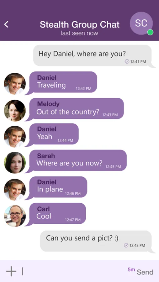 SELF-DESTRUCTING MESSAGES: StealthChat provides a “burn” timer to automatically delete messages and pictures after they have been read.