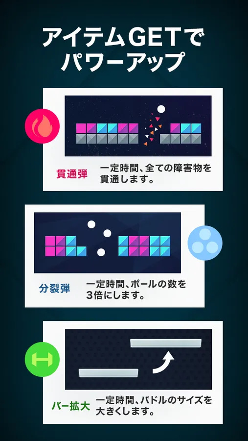 3種のアイテムを駆使してブロックと”鍵”を破壊しましょう 。