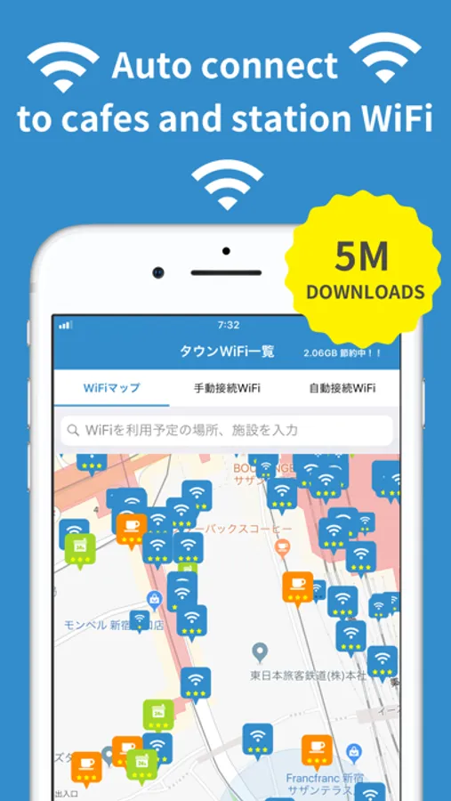 You can connect to over 2M WiFi automatically in US, Japan, Taiwan, Hong Kong, Macau and Korea, by choosing WiFi spot from App.