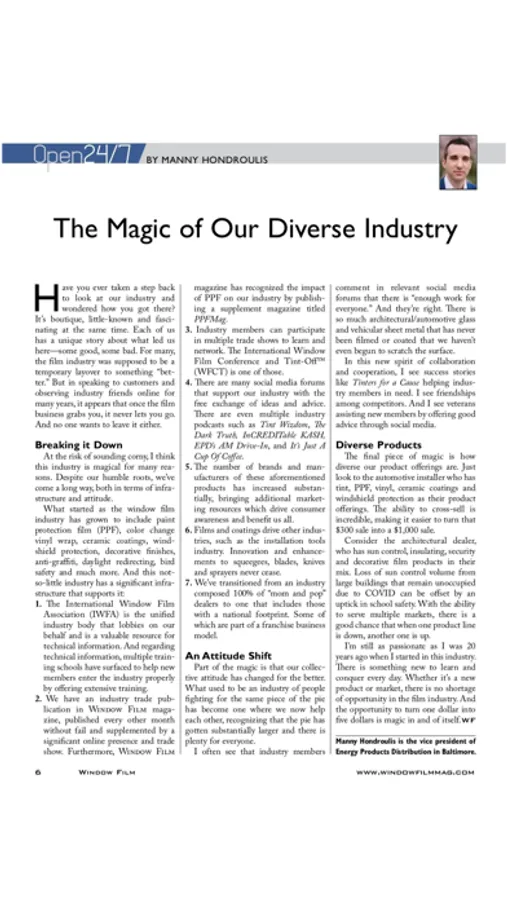 WINDOW FILM magazine serves the entire film industry, providing news on: automotive, paint protection, security, decorative and architectural films. WINDOW FILM also provides a weekly e-newsletter, Focus on Film. The magazine manages the International Window Film Conference and Tint-Off™, where attendees can view seminars, products and compete in Tint-Off competitions. For a free subscription or to learn more, visit www.windowfilmmag.com. Bi-monthly video newscasts of FILM’d are available for view on the site or on YouTube Channel WindowFilmMag.