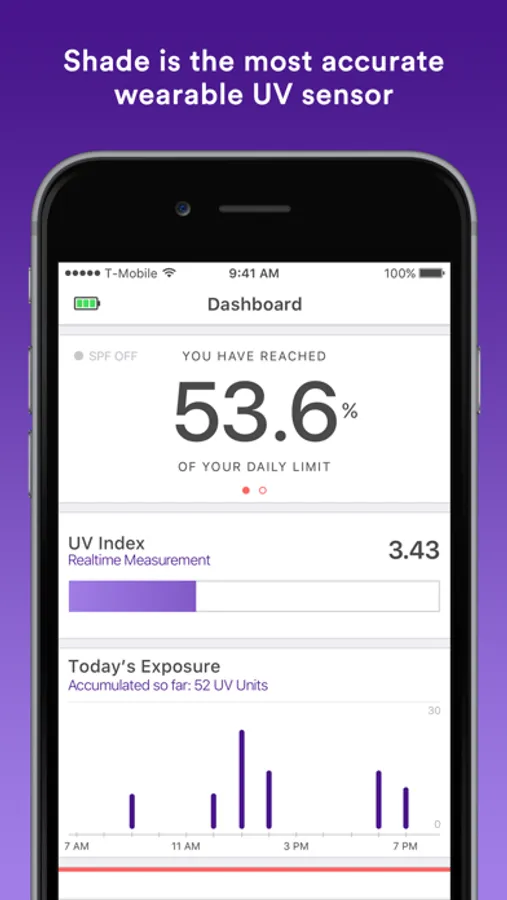 Using the app, you can then select the amount of UV exposure you would like to manage every day. The Shade app is your companion and will actively help you manage your personal tolerance to UV exposure so that you can step outside with confidence.