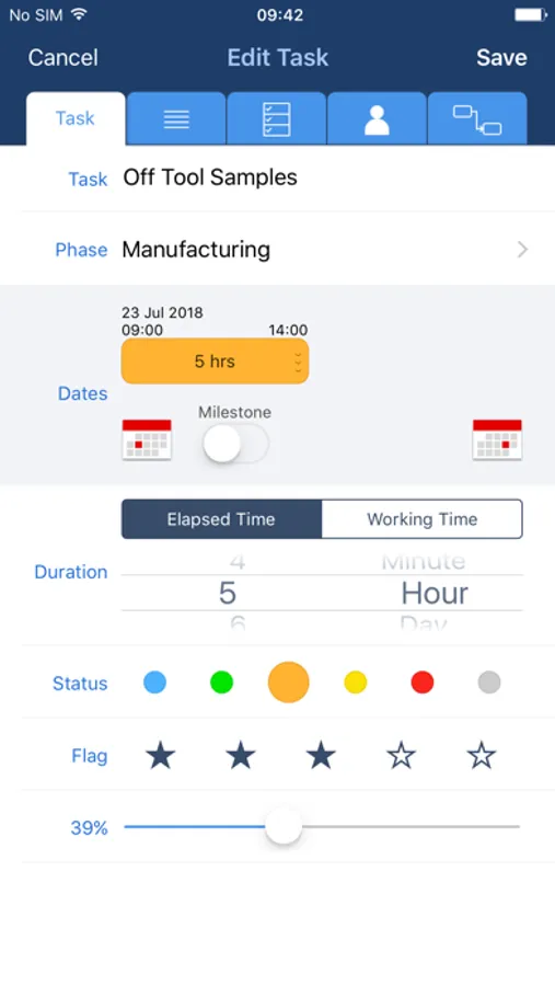 - Description, notes, dates, duration, status, flag, percent complete and resource.