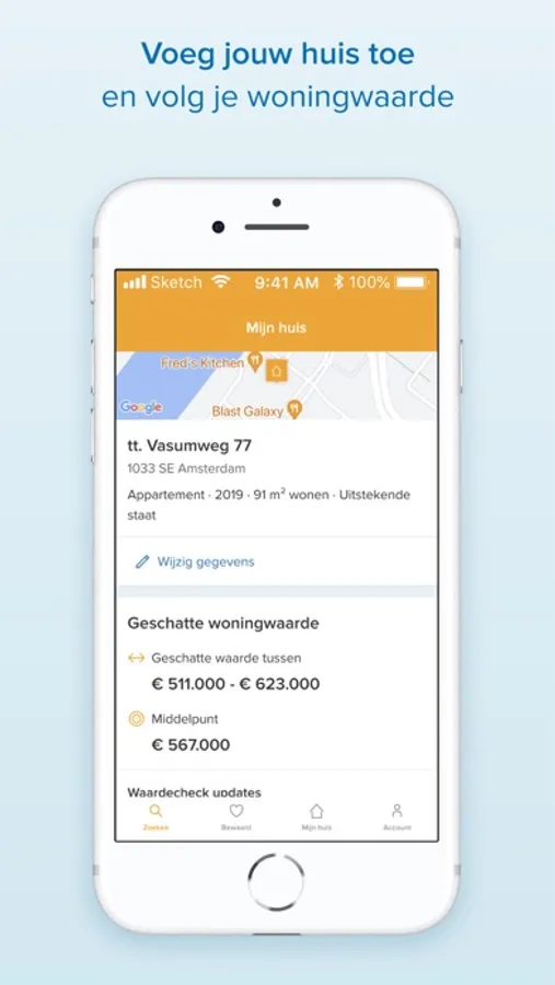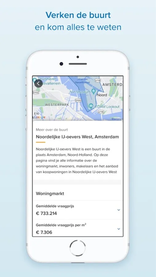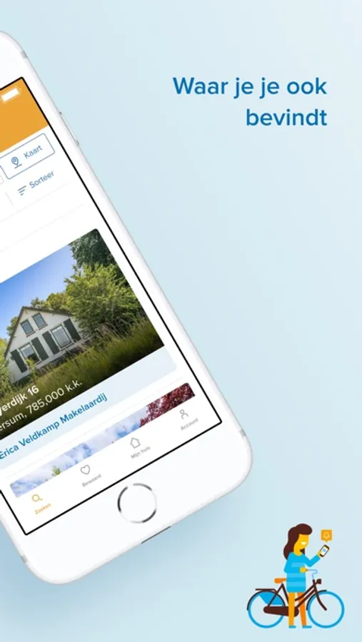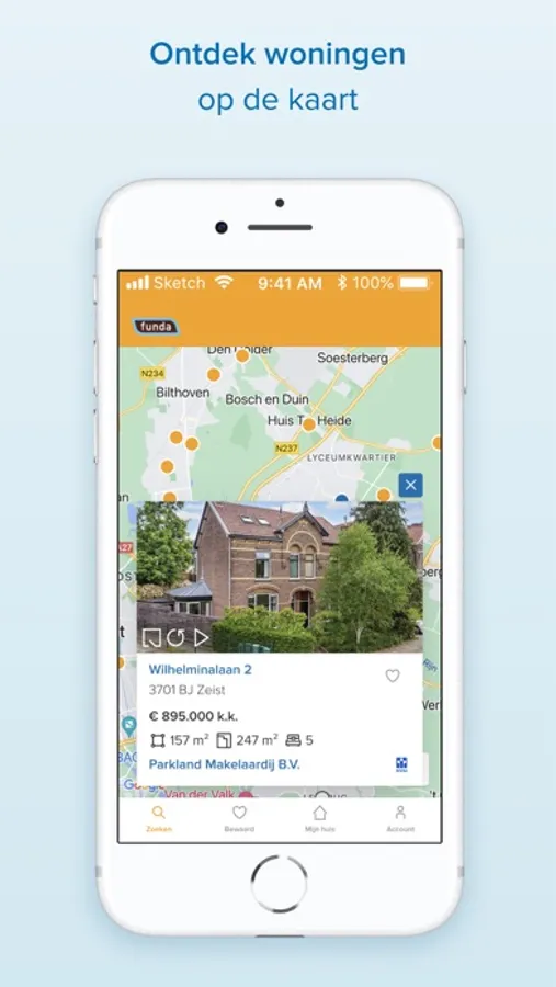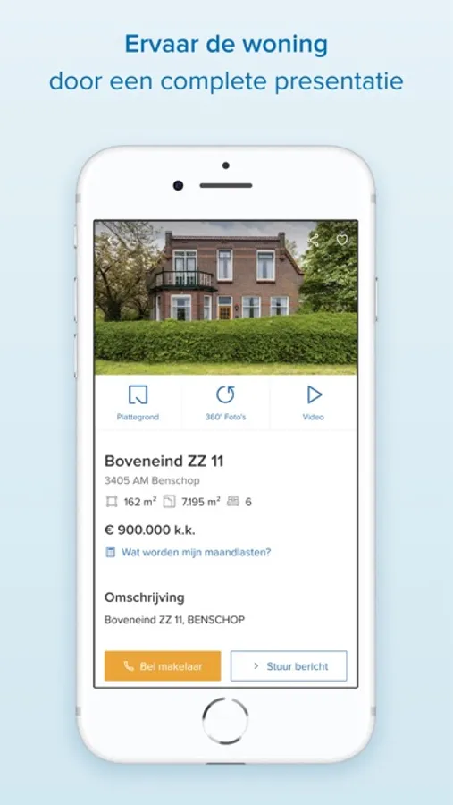 Of je nu zoekt in de lijst met woningen of op de kaart, je krijgt direct een eerste indruk van het huis. Dankzij de grote foto’s zie je meteen of het iets voor je is. Op de kaart kun je een woning even snel ‘previewen’ door op de marker te tikken. Lijkt het je wat? Dan kun je daarna natuurlijk ook gewoon álle foto’s, 360° foto’s, video’s en plattegronden van het huis bekijken.