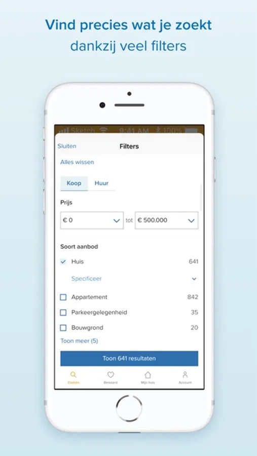 Je kunt al je persoonlijke voorkeuren instellen in je zoekopdracht, zodat je in de lijst of op de kaart alleen huizen ziet die écht bij jouw woonwensen passen.