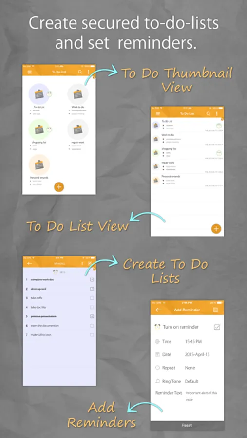 • Set reminders on your secret notes and to-do lists