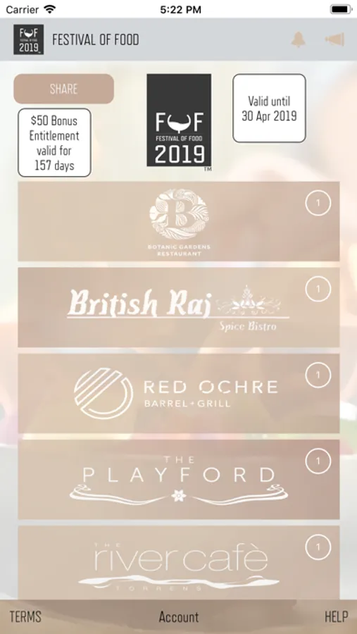 The Festival of Food app offers paperless participation and redemption and features program detail, venue information, reservations, Bonus offer eligibility and access to the latest specials and up-to-date communication throughout the year.