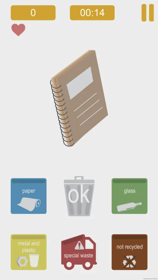 Once you start the game you will see an object and will have to decide in which bin(s) this object has to go on the basis of the material(s) of which the object is made. There are five waste separation bins among which you can choose: blue bin - paper, green bin - glass, yellow bin - plastic and metal, dark brown bin - not recycled, a little red truck bin - special waste (waste that has to be specifically taken away by some institution, e.g. medical waste, or put in special places, e.g. electronics, batteries etc.). Once the object appears on the screen tap the bin(s) where you think it belongs and then click the OK button. Then, the next object will appear. Small ticks will appear on the waste separation bins you have tapped to show you which bin(s) you have chosen for the current object.