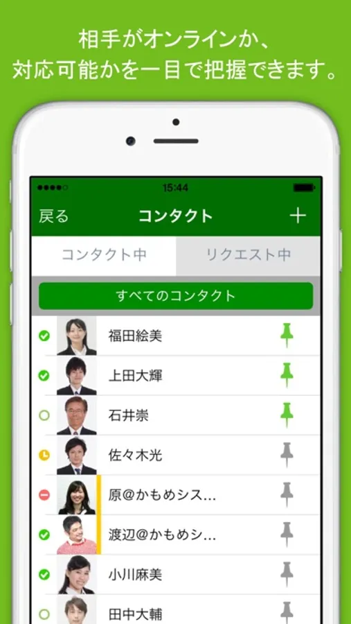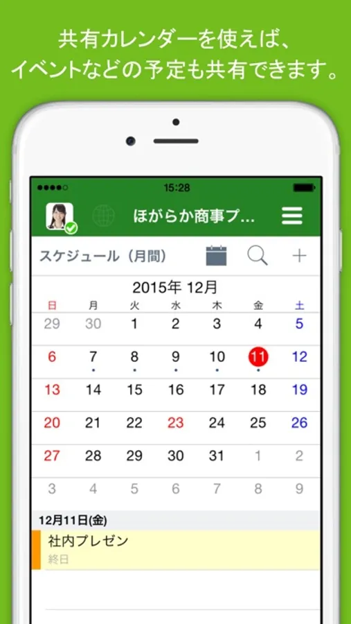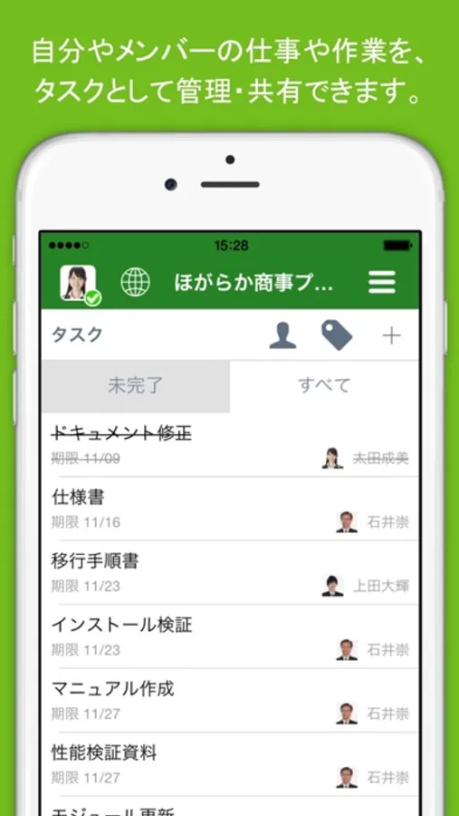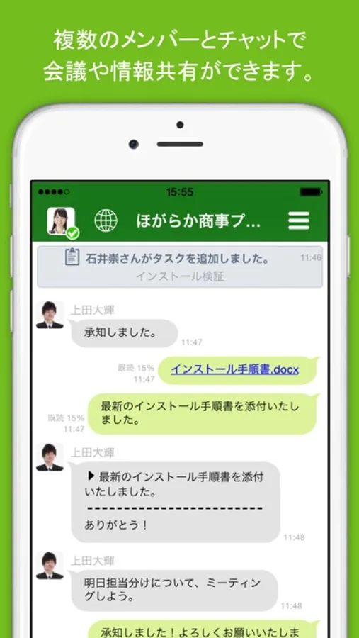 スマートフォンやPCを用いて、社内外のメンバーとのリアルタイムチャットを行えるほか、ファイルの共有、タスク・スケジュールの管理、アンケートの収集・集計など、日々の業務と共同作業を効率化する多くの機能を利用できます。メンバーの在席状況の確認や、無料の音声・ビデオ通話、PC画面の共有にも対応しています。